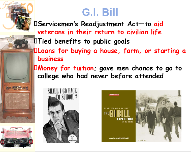 The GI Bill also allowed veternans to purchase homes with low interest loans.
