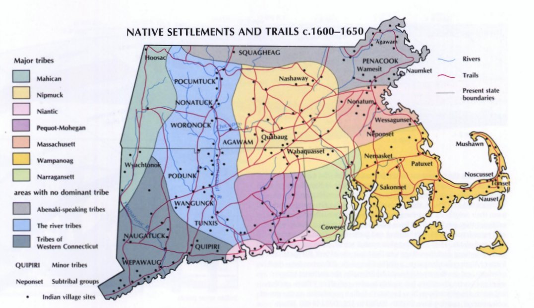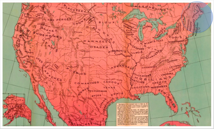 Look closely at the map below. Which tribe of Native Americans lived in the area where the Pilgrims settled?
