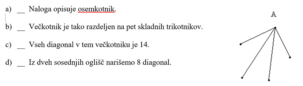 4 diagonale. Aljaž je narisal 8-kotnik. Je trditev pravilna ali napačna?