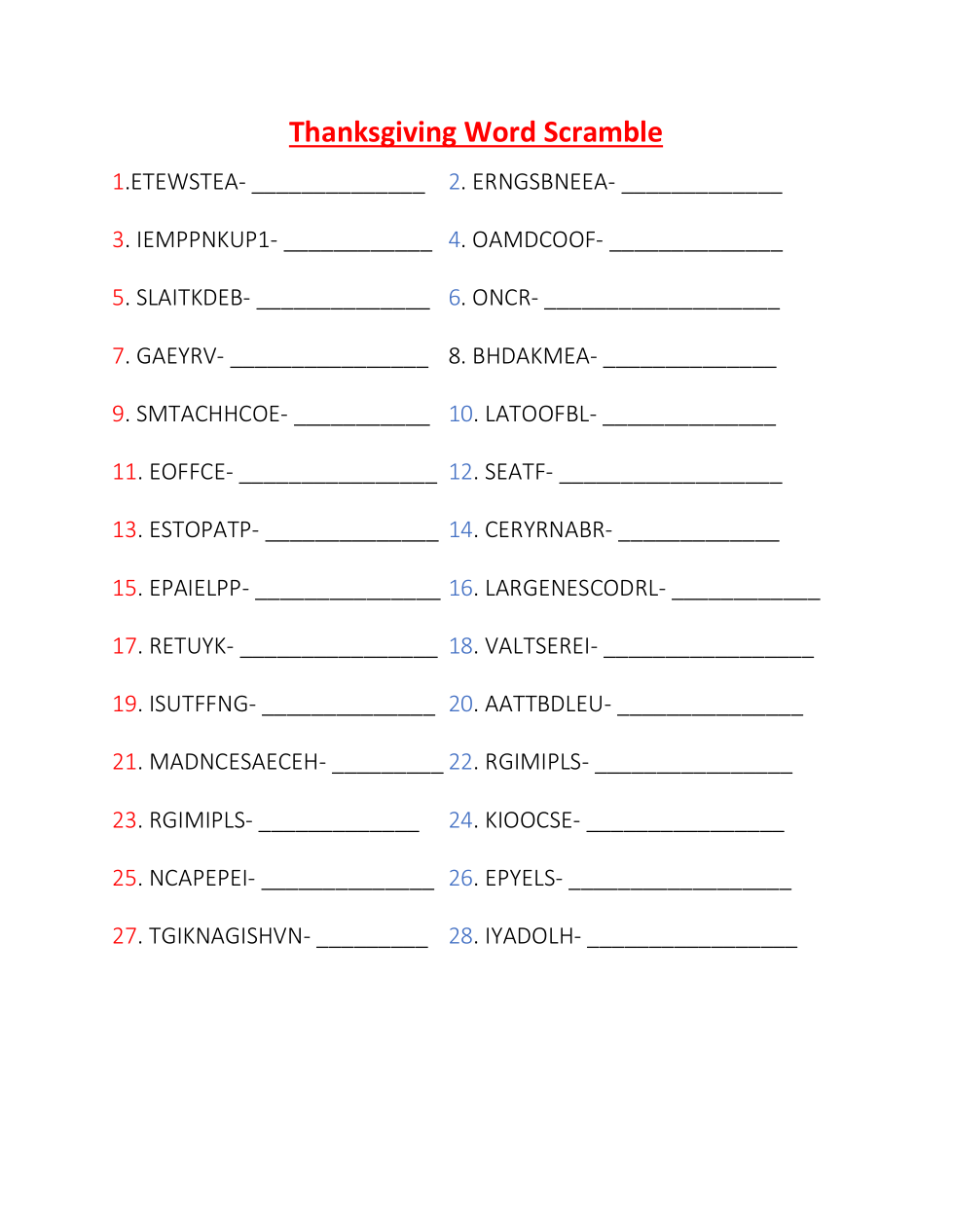 Turkey Day Word Scramble