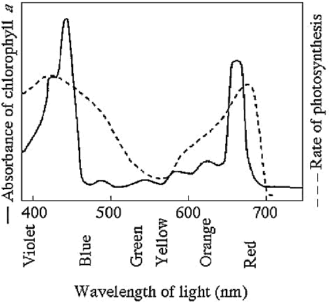 The figure shows the absorption spectrum for chlorophyll a and the action spectrum for photosynthesis. What colors of light are least effective in driving photosynthesis?