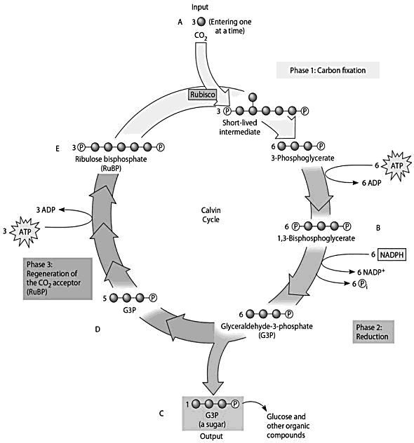 An early step in the process of carbon fixation combines three molecules of CO2 with three molecules of RuBP to produce three 6-carbon molecules, which are immediately converted to six 3-carbon molecules. These six molecules are phosphorylated and reduced to produce glyceraldehyde 3-phosphate (G3P). What additional events occur to complete the Calvin cycle?