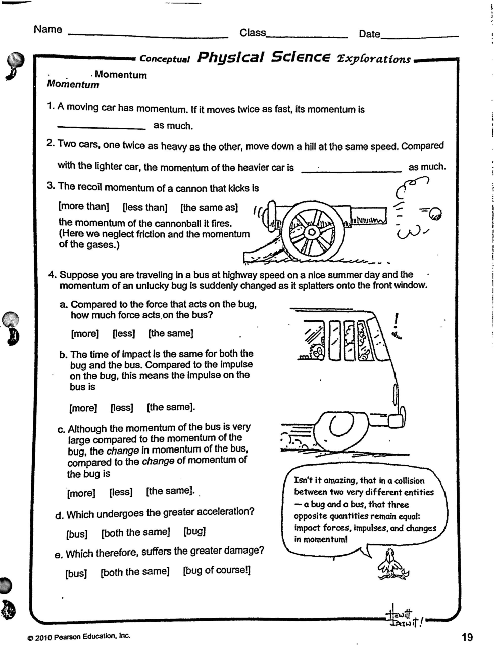 Although the momentum of the bus is very large compared to the momentum of the bug, the change in momentum of the bus compared to the change in momentum of the bug is