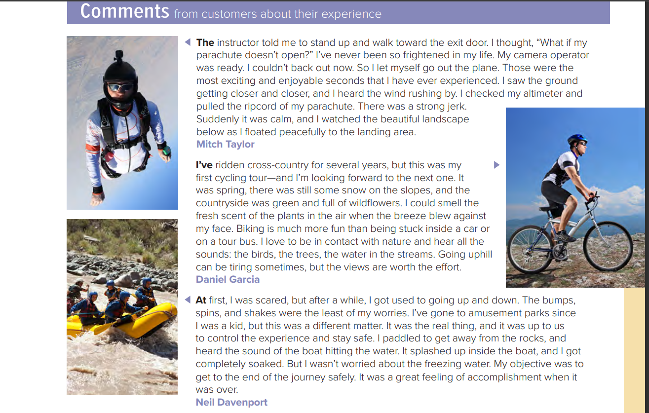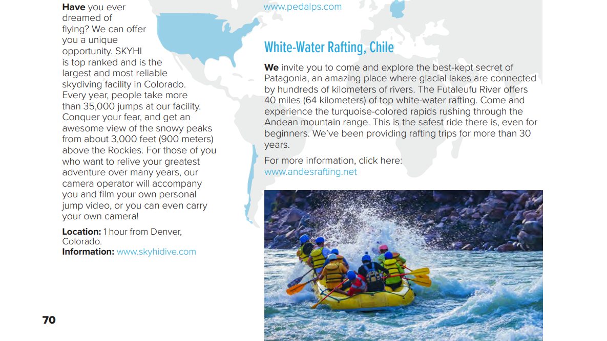 Scan the text then answer the question. Question 2\ What are the three adventure sports mentioned in the subtitles in page 70?