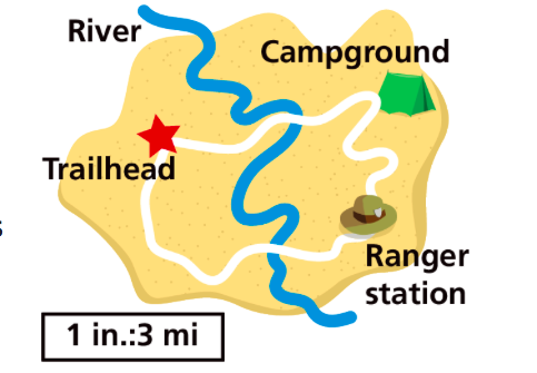 En el mapa, la distancia entre el sendero y el campamento es de 4 pulgadas. ¿Cuál es la distancia real.