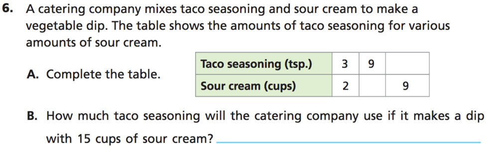 Una empresa de catering mezcla condimento para tacos y crema agria para hacer una salsa de verduras. La tabla muestra las cantidades de condimento para tacos para varias cantidades de crema agria.