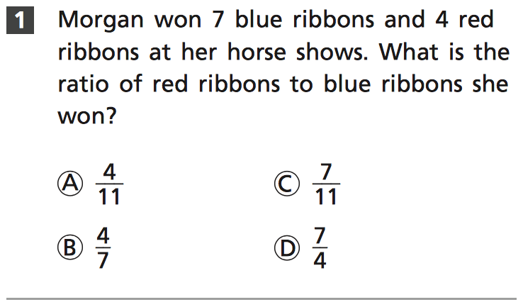 Morgan ganó 7 cintas azules y 4 rojas en sus concursos hípicos. ¿Cuál es la proporción de cintas rojas y azules que ganó?