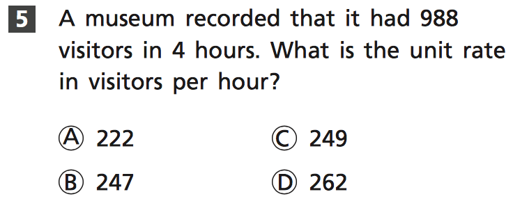 Un museo registró que tuvo 988 visitantes en 4 horas. ¿Cuál es la tasa unitaria de visitantes por hora?