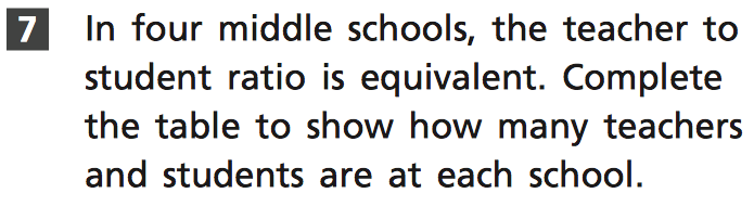 En cuatro escuelas secundarias, la proporción de profesores y estudiantes es equivalente. Completa la tabla para mostrar cuántos profesores y estudiantes hay en cada escuela.