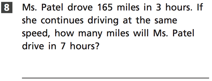La Sra. Patel condujo 165 millas en 3 horas. Si sigue conduciendo a la misma velocidad, ¿cuántos kilómetros recorrerá la Sra. Patel en 7 horas?