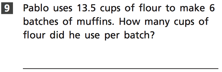 Pablo usa 13.5 tazas de harina para hacer 6 lotes de magdalenas. ¿Cuántas tazas de harina usó por lote?