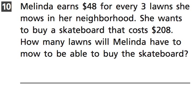 Melinda gana 48 dólares por cada 3 céspedes que corta en su vecindario. Quiere comprar una patineta que cuesta $208. ¿Cuántos céspedes tendrá que cortar Melinda para poder comprar la patineta?