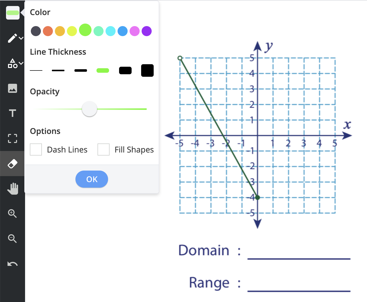 Find the domain and range for each graph. In the show your work window, you can find a highlighter (see image below for a visual). Highlight boundaries of domain & range of each graph. Then use the draw feature to express the domain and range in interval notation.