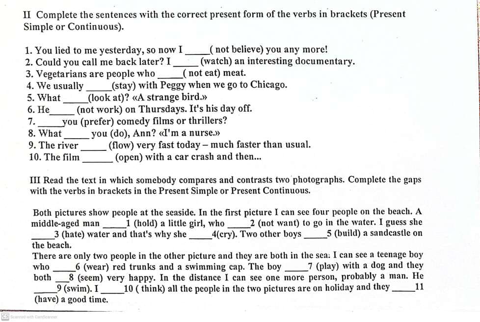 II./III. Complete the sentences with the correct present form of the verbs in brackets - present simple or continuous.