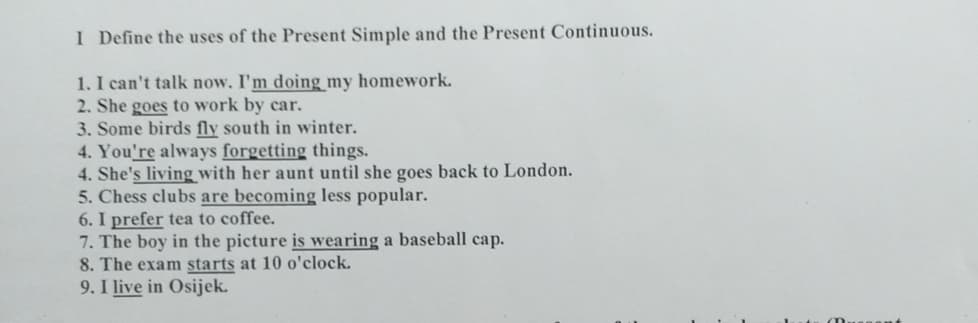 I. Define the uses of the Present simple and the Present continuous in the following sentences. Choose from the following uses and make sure that you type them correctly in the form they are listed in the task: