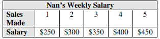 Nan works as a comissioned sales rep. She works for a weekly base salary plus the commission off of each sale she makes. The table below shows how much Nan can make. What is her weekly base salary? How do you know?