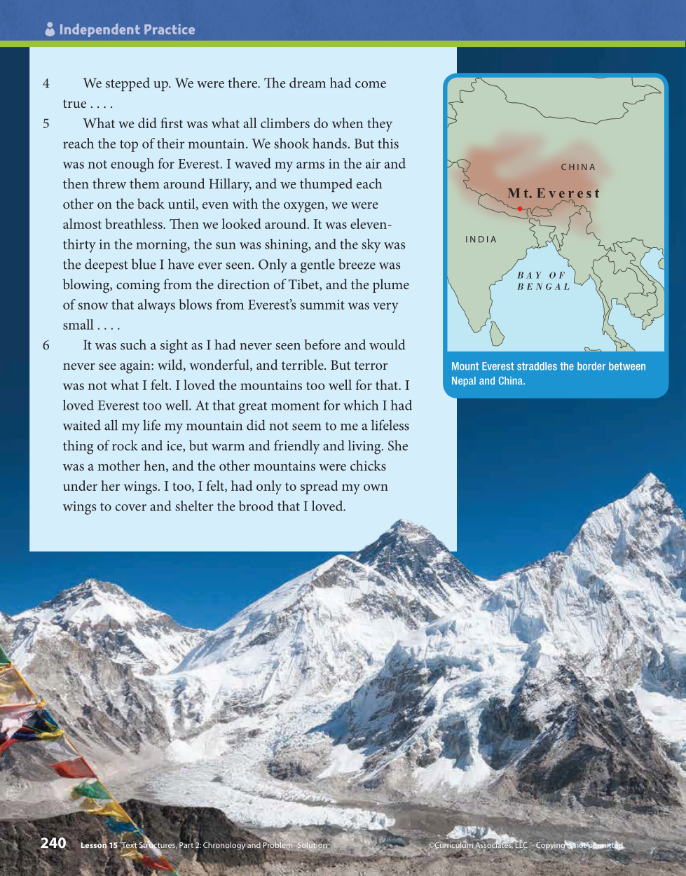 - Tenzing compares the mountain to a mother hen with chick under her wings.