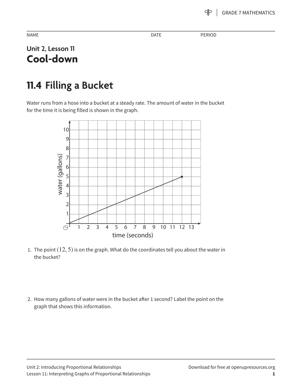 How many gallons of water were in the bucket after 7 seconds. (it's different than the page) Draw that point on the graph.