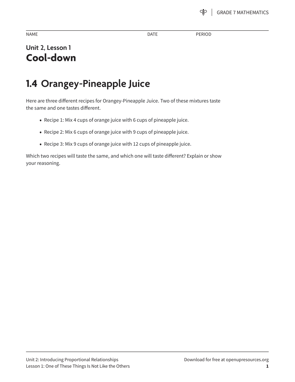 Which 2 recipes will taste the same? Show your work (maybe with tables?)