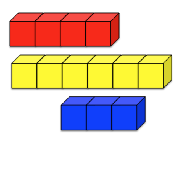 Val built three trains of blocks. Name the trains in order from shortest to longest.