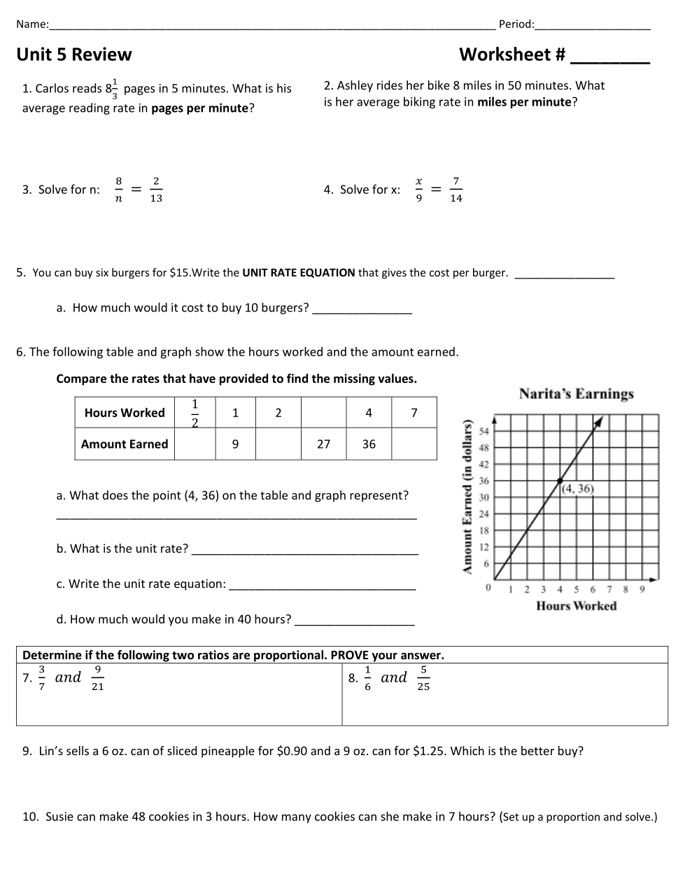 5) You can buy six burgers for $15. Write the UNIT RATE EQUATION that gives the cost per burger.