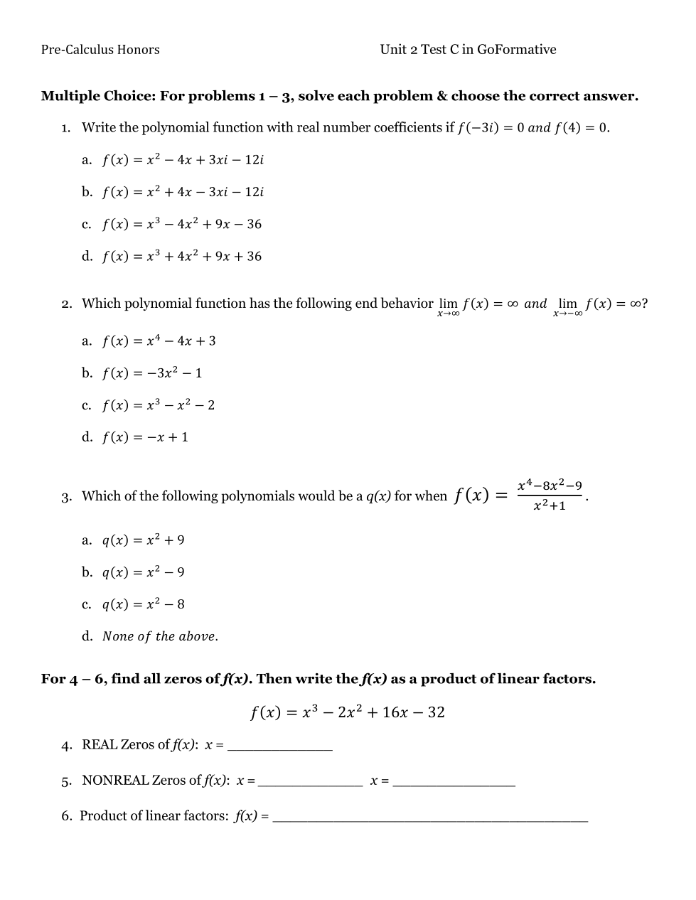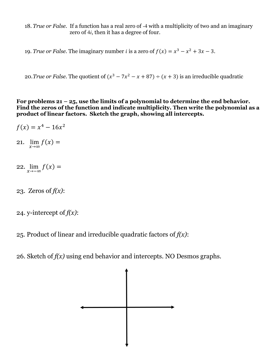 Write the polynomial function f(x) with real coefficients if f(-3i) = 0 and f(4) = 0.