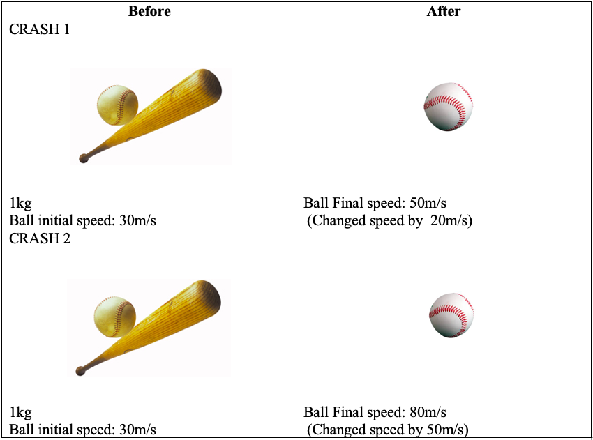 Why do you think Crash 1 or 2 has more force than the other? Use the words (force, mass, change in speed)
