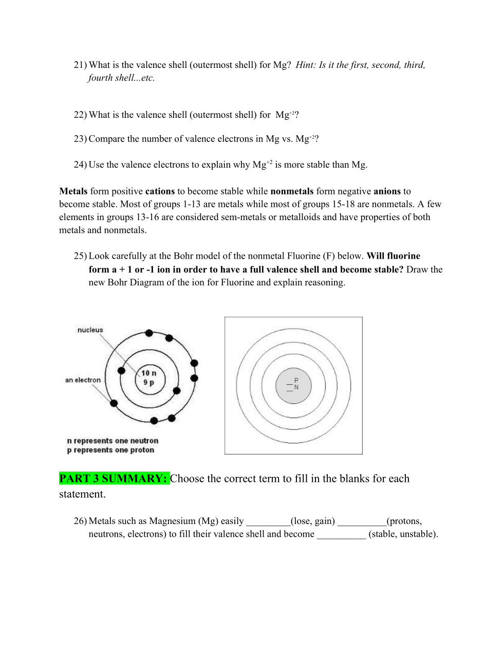 Metals such as Magnesium (Mg) easily _________(lose, gain) __________(protons, neutrons, electrons) to fill their valence shell and become __________ (stable, unstable). Choose the three correct terms to fill in blanks