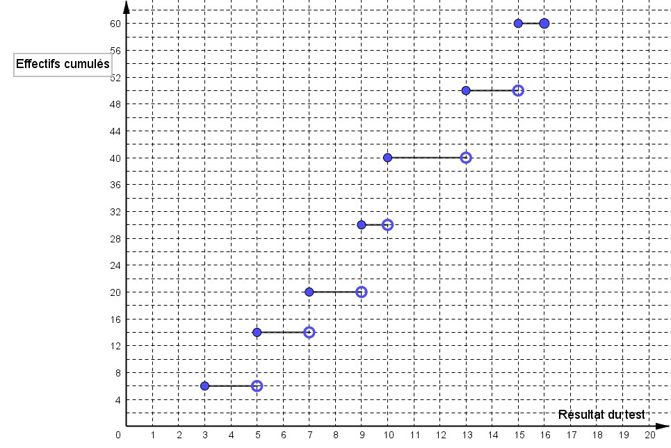 Dans une classe de 60 élèves, on a réalisé un test de mathématique coté sur 20. Le professeur a obtenu le graphique des effectifs cumulés ci-dessous. Que vaut le premier quartile? Tu donnes ta réponse ET tu indiques sur le graphique dans la zone "show your wordk" comment tu le détermines!