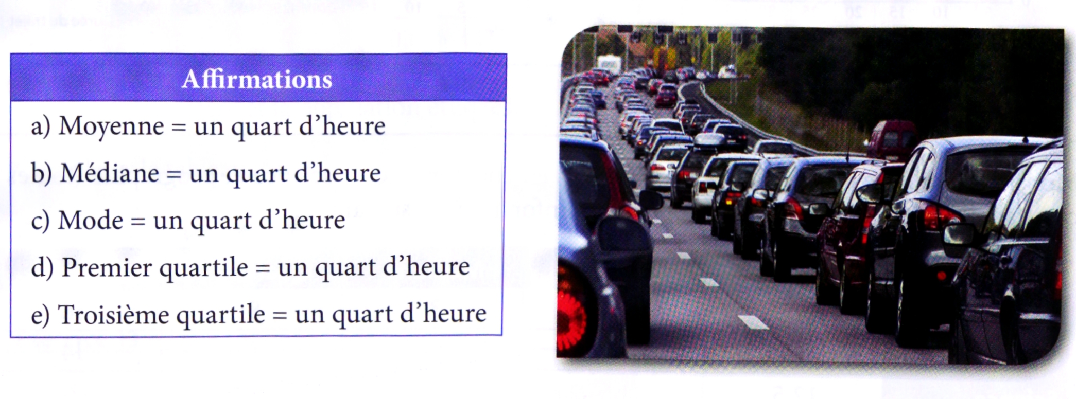 On a demandé aux élèves d'une école quel temps il leur fallait pour se rendre à l'école le matin. Cette enquête a permis de calculer les éléments donnés à côté de l'image. Parmi les propositions, coche celles qui sont vraies.