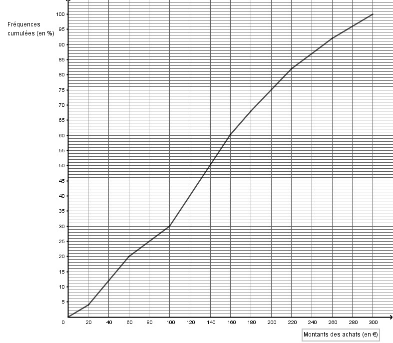 Voici un graphique des fréquences cumulées. Que vaut la médiane? Tu donnes ta réponse ET tu indiques sur le graphique dans la zone "show your wordk" comment tu la détermines!