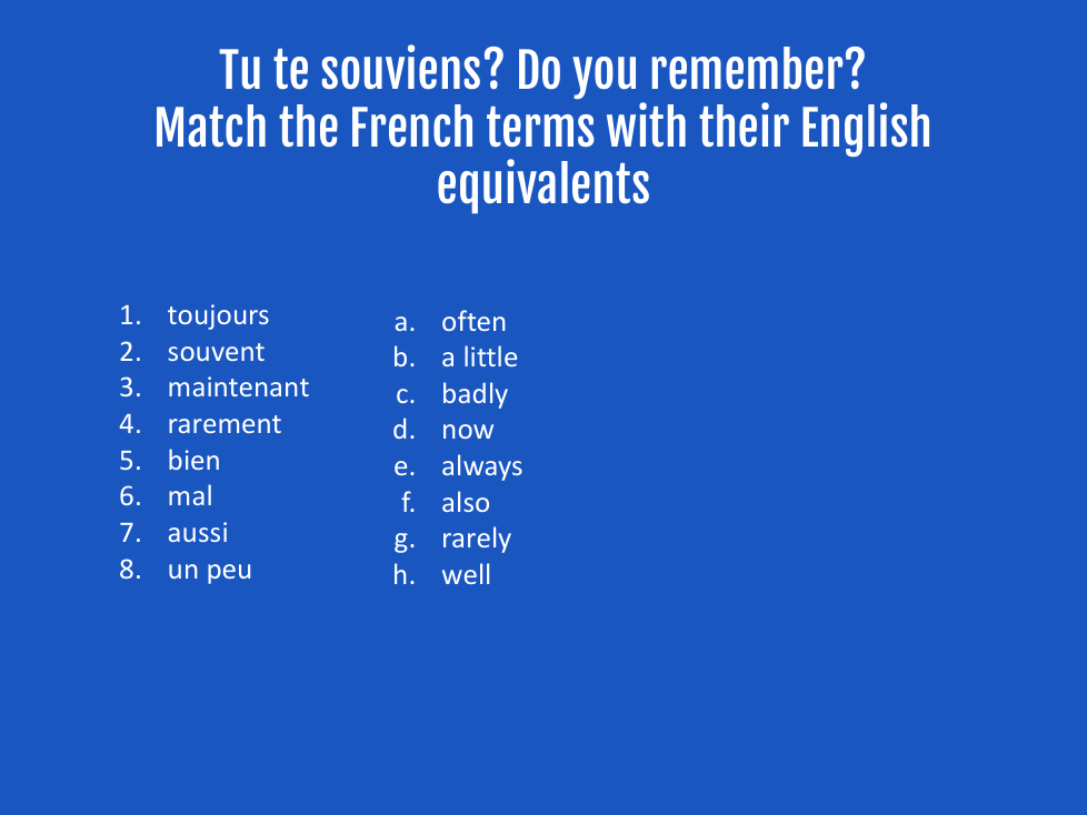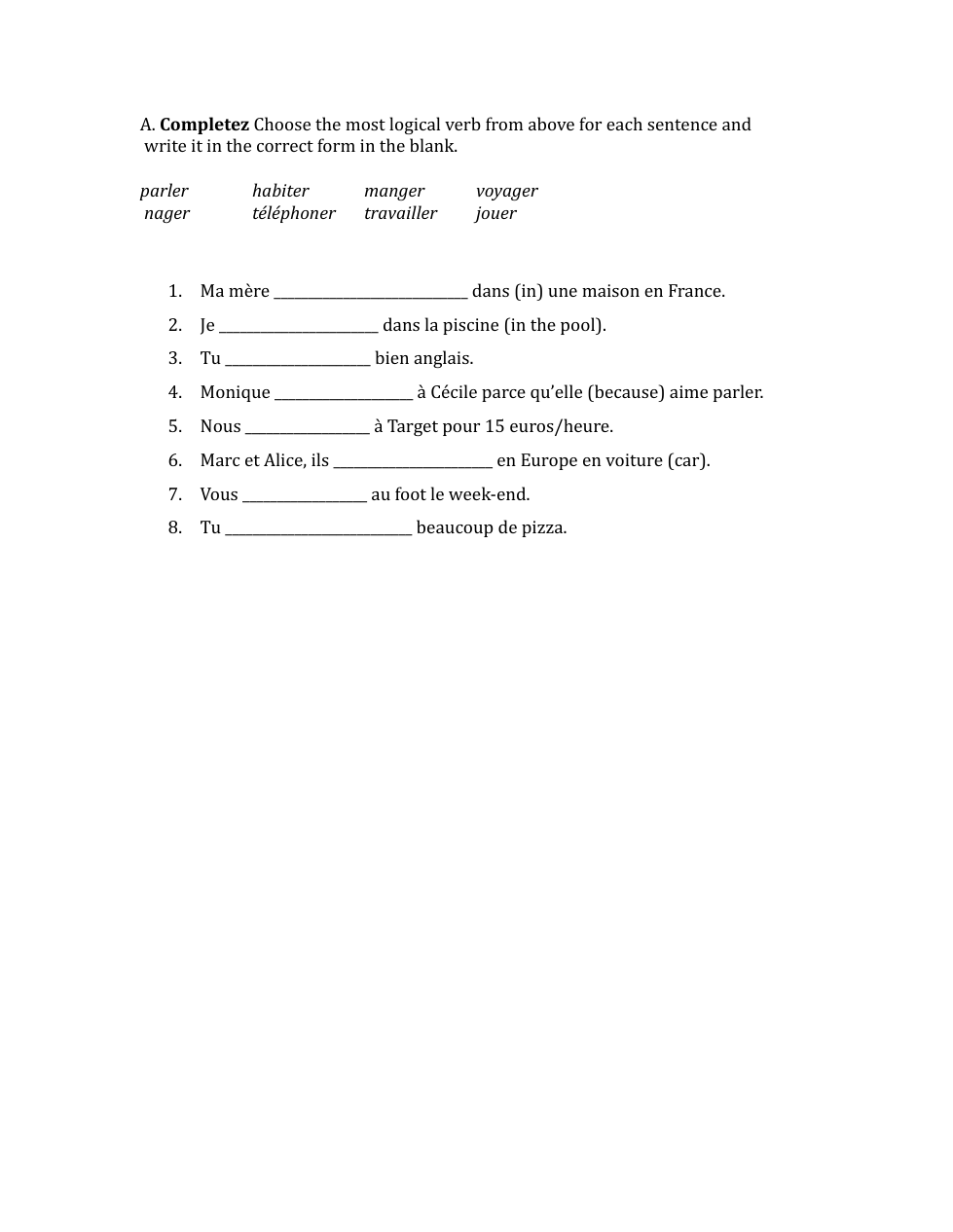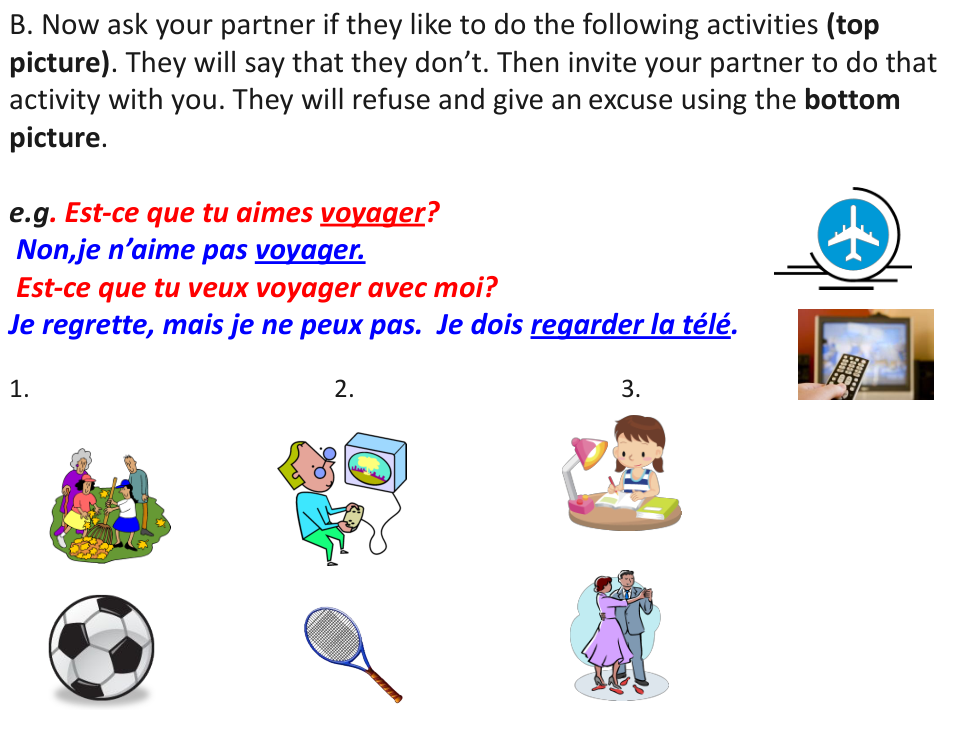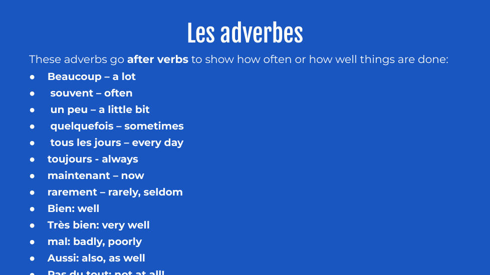 e.g. En été, il fait beau. J’aime manger au restaurant. Aussi, je dîne avec ma famille. Je voyage souvent à la plage. Je n’aime pas étudier mais j’aime parler français avec mes amis.