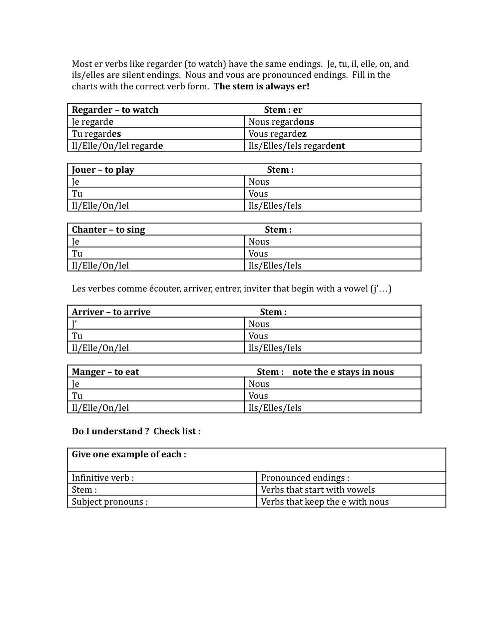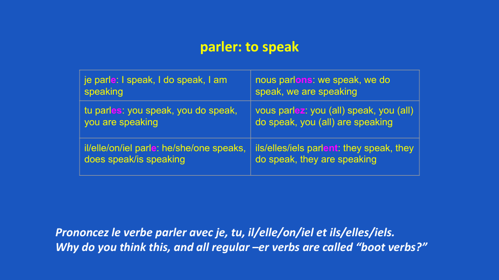 je-e, tu-es, il,elle,on/iel-e, nous-ons, vous-ez, ils/elles/iles- ent