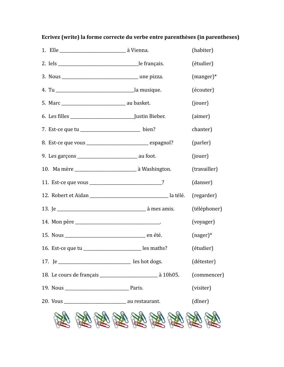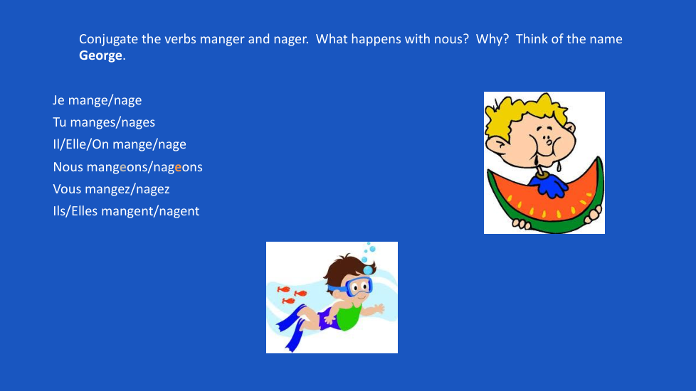 Conjugate them with –je or nous if necessary. (Some might be in the infinitive. [e.g. J’aime manger au restaurant, nous aimons danser.] *** Remember not to conjugate the 2nd verb!