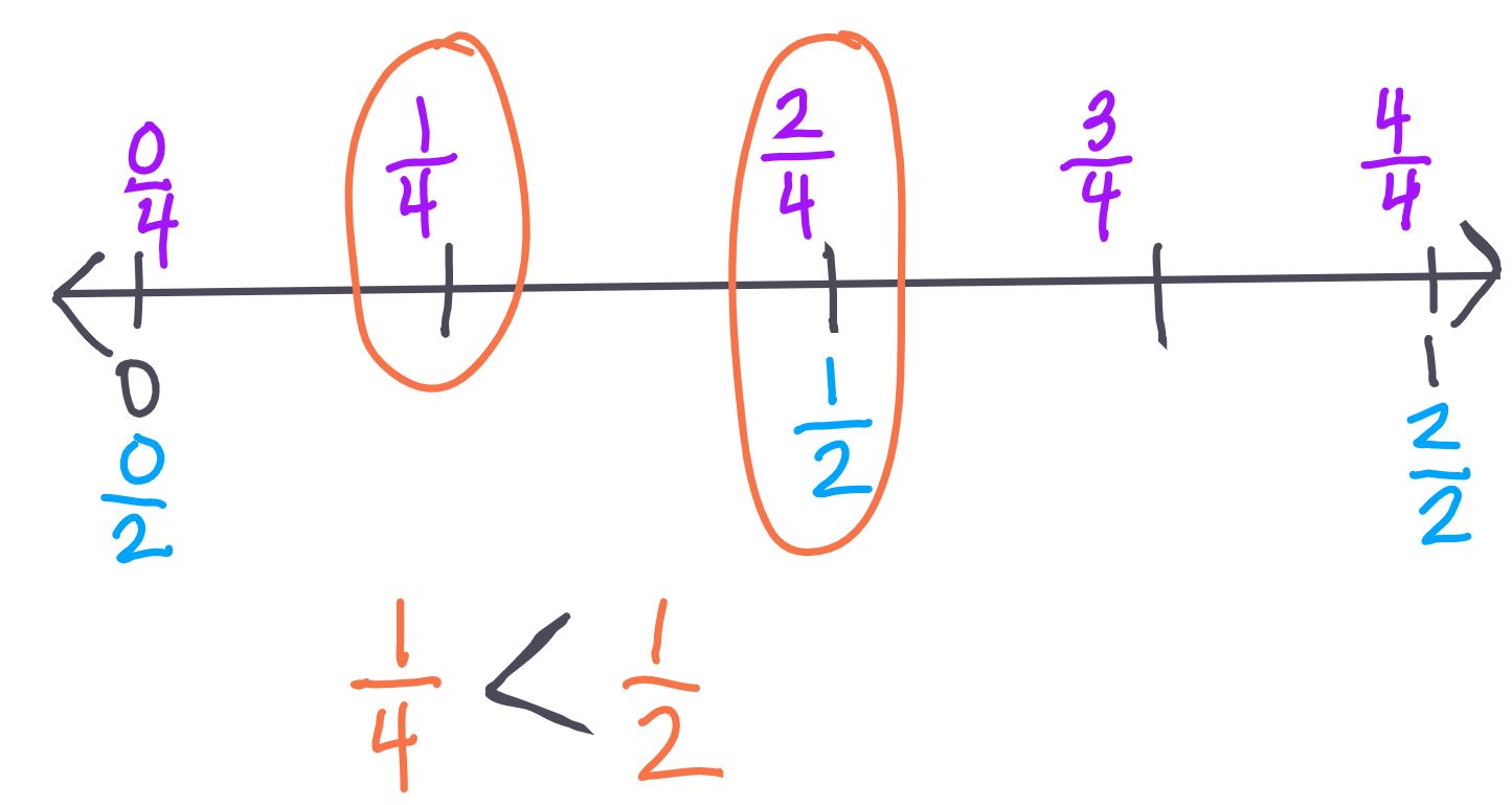 Use a number line to compare the two fractions below using > , < , or =Make sure to label and show ALL of your work.
