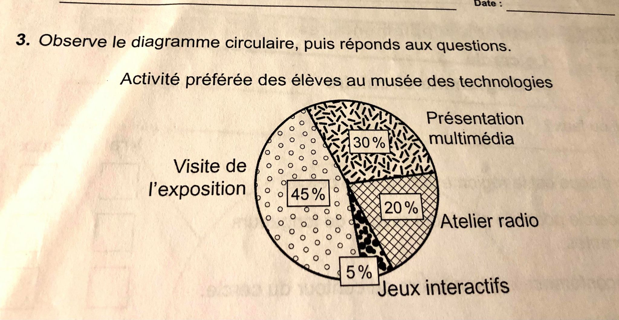 À l'aide des indices, remplis les étiquettes du diagramme circulaire. Trouve aussi un titre.