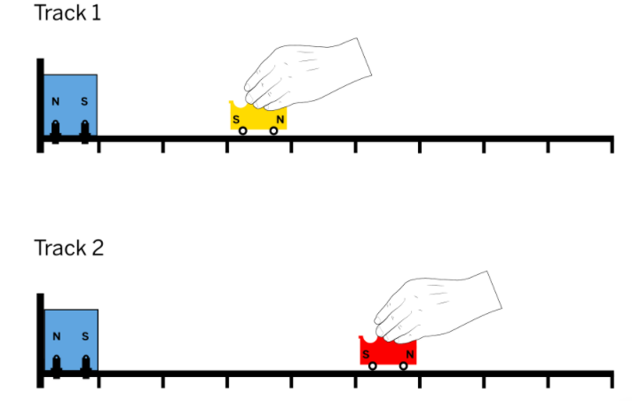 Pablo sets identical magnetic carts on two tracks. At the end of each track is a blue magnet that cannot move. Pablo can move the carts one space to the left or one space to the right. Which movement (left or right, AND on which track) will increase the potential energy in the system the most?