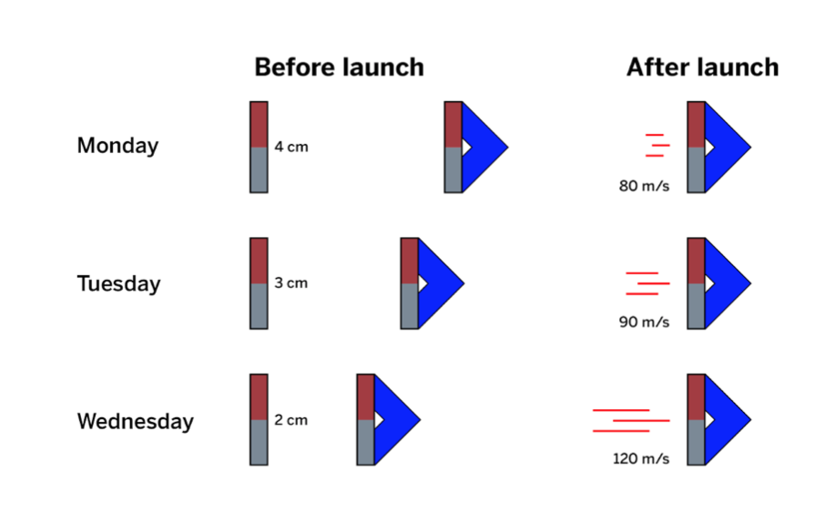 Create models of the Tuesday and Wednesday spacecraft launches to explain the difference in speed. Use a magnet to represent the spacecraft in each launch. Use the symbols shown in the Key in your models.