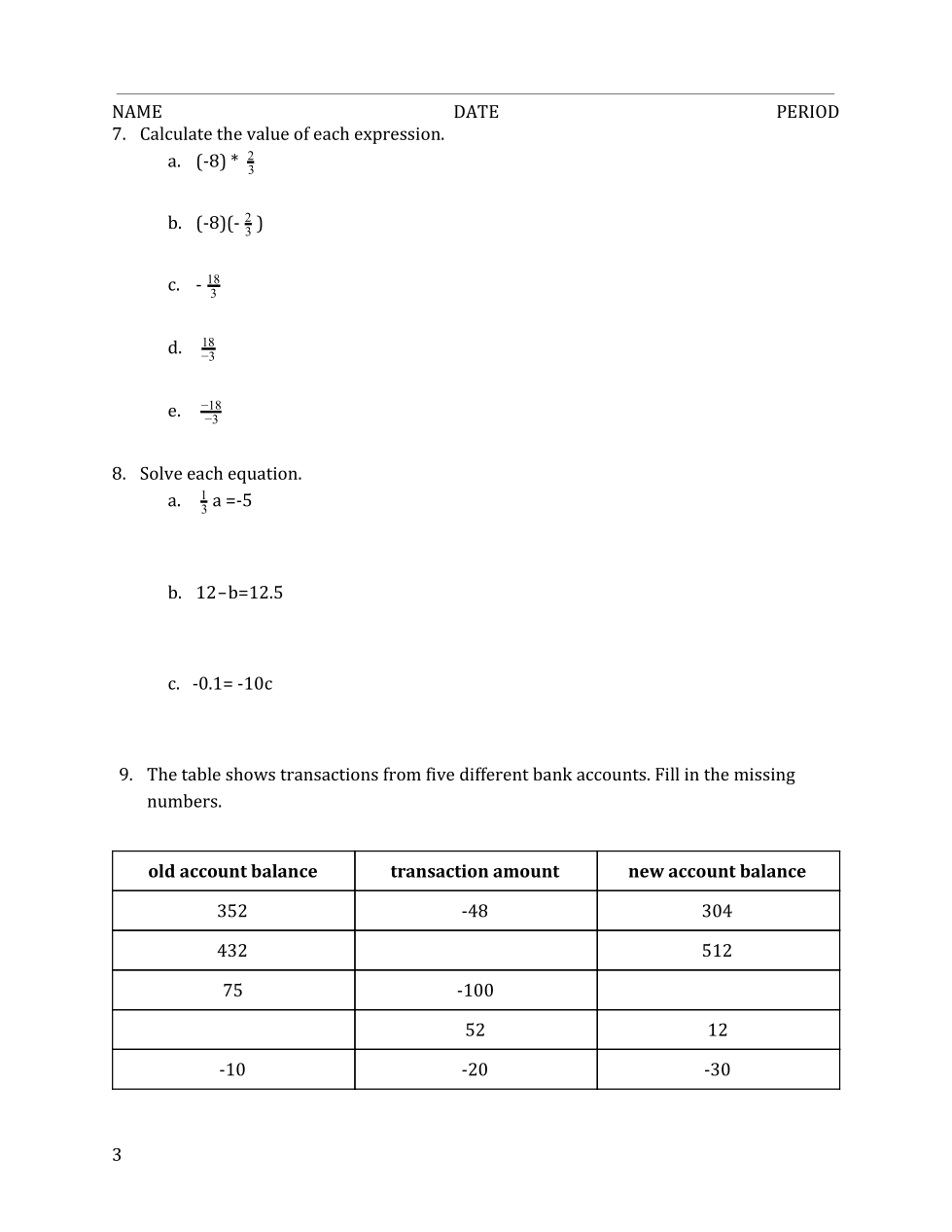 The table shows transactions from five different bank accounts. Fill in the missingnumbers.