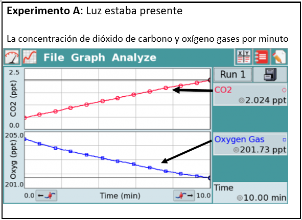 A continuación, se presentan los datos obtenidos de un experimento en un organismo desconocido. El espécimen se colocó en la luz. Las siguientes grafica muestra las cantidades de dióxido de carbono y oxígeno. (HS LS 1-5, HS LS 1-7)