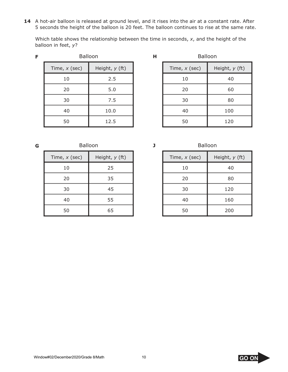 Which table shows the relationship between the time in seconds, x, and the height of the balloon in feet, y?