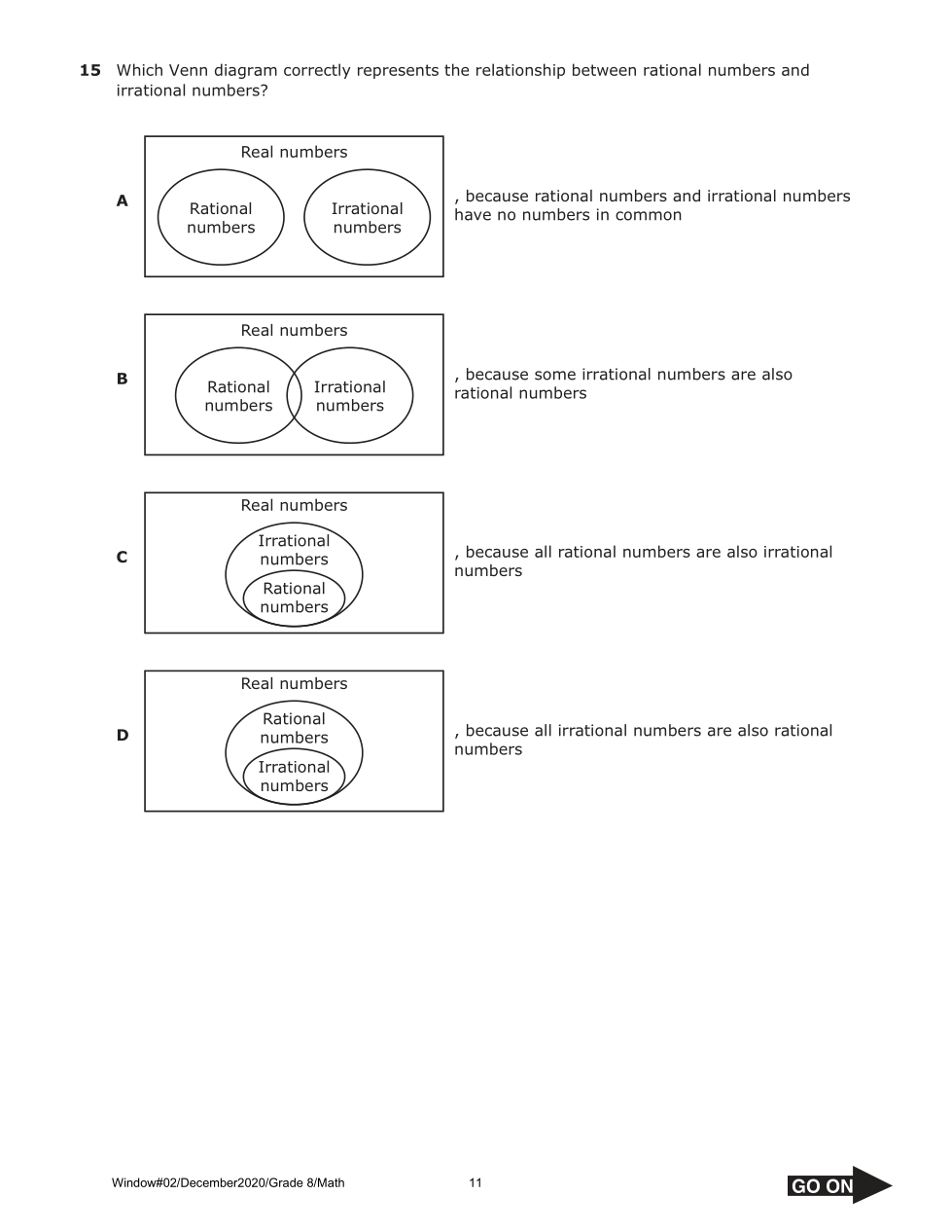 Which Venn diagram correctly represents the relationship between rational numbers and irrational numbers?