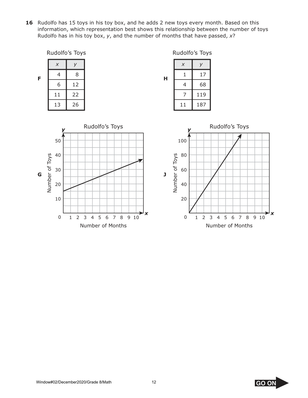 Rudolfo has 15 toys in his toy box, and he adds 2 new toys every month. Based on this information, which representation best shows this relationship between the number of toys Rudolfo has in his toy box, y, and the number of months that have passed, x?