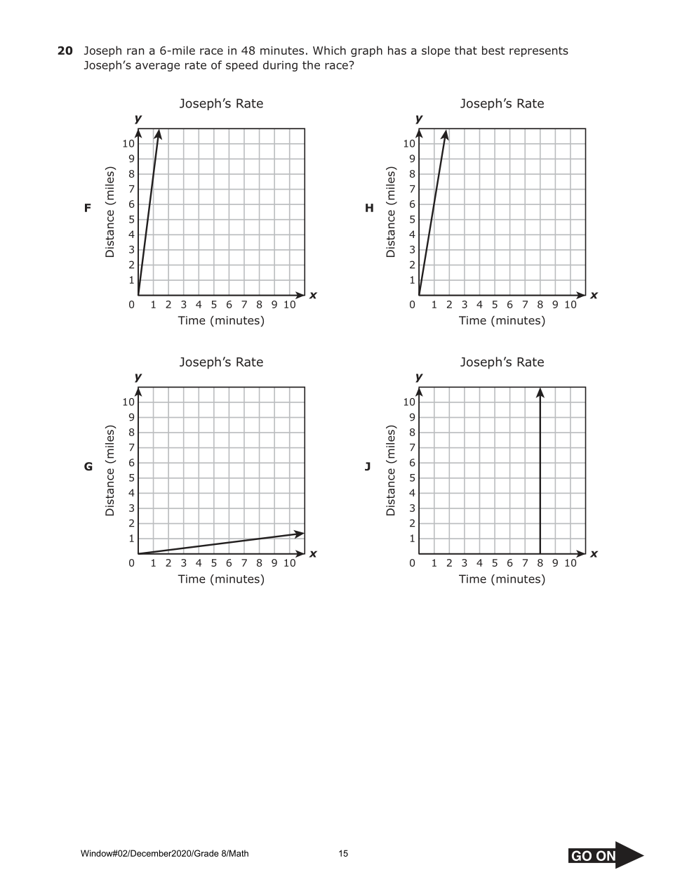 Joseph ran a 6-mile race in 48 minutes. Which graph has a slope that best represents Joseph’s average rate of speed during the race?