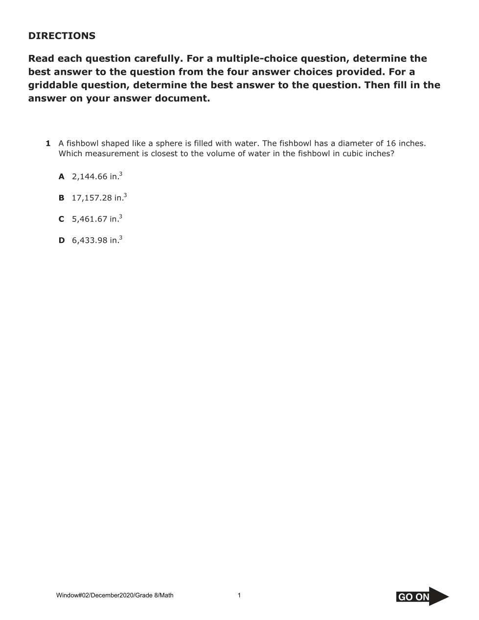 A fishbowl shaped like a sphere is filled with water. The fishbowl has a diameter of 16 inches. Which measurement is closest to the volume of water in the fishbowl in cubic inches?
