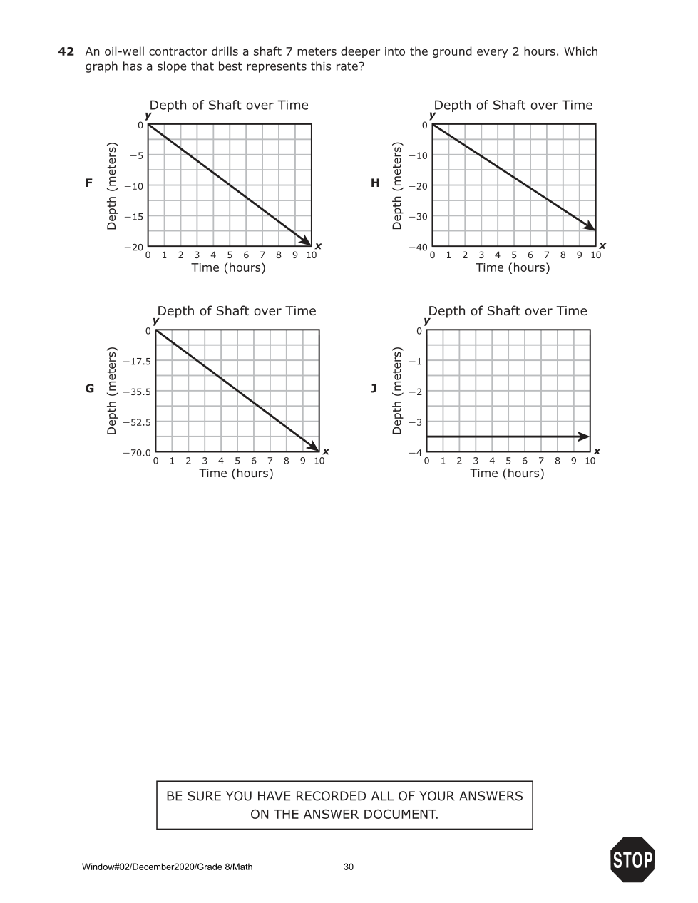 An oil-well contractor drills a shaft 7 meters deeper into the ground every 2 hours. Which graph has a slope that best represents this rate?