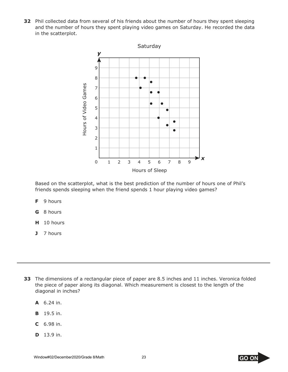 The dimensions of a rectangular piece of paper are 8.5 inches and 11 inches. Veronica folded the piece of paper along its diagonal. Which measurement is closest to the length of the diagonal in inches?