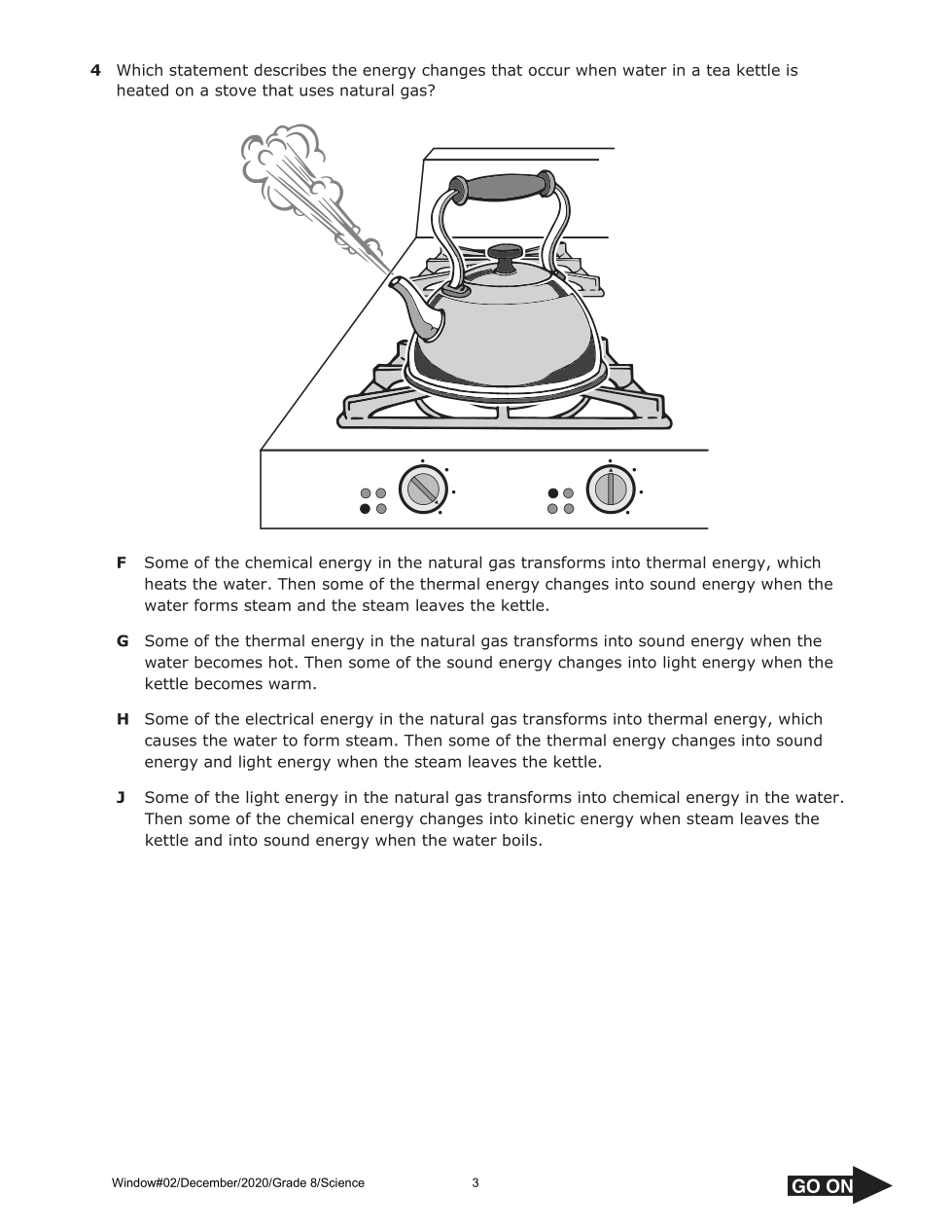 Which statement describes the energy changes that occur when water in a tea kettle is heated on a stove that uses natural gas?