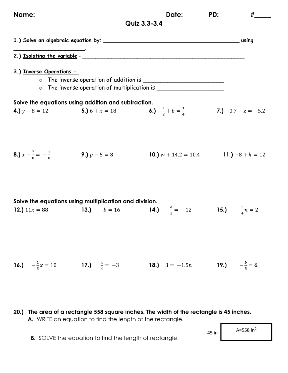The area of a rectangle is 558 square inches. The width of the rectangle is 45 inches.A. Write an Equation to find the length of the rectangle.B. Solve the equation to find the length of the rectangle.