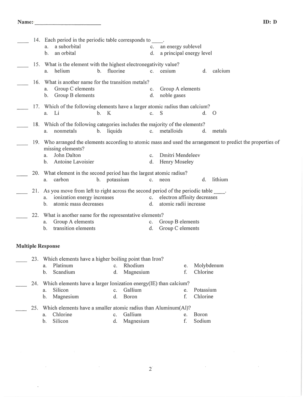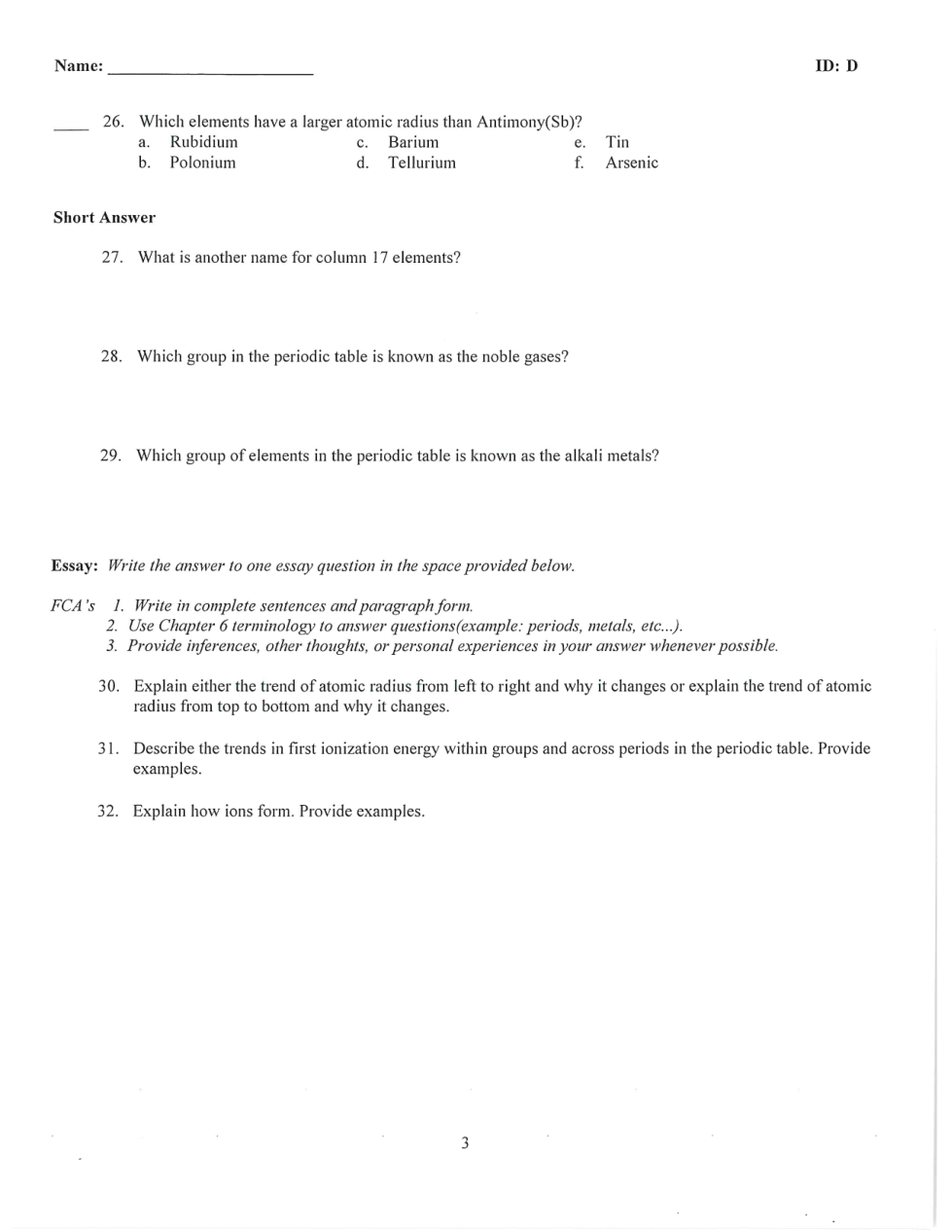 Chapter 6 Test Periodic Table D
